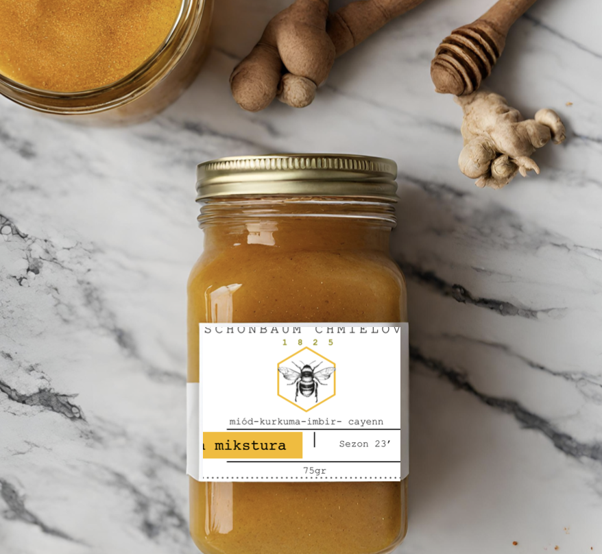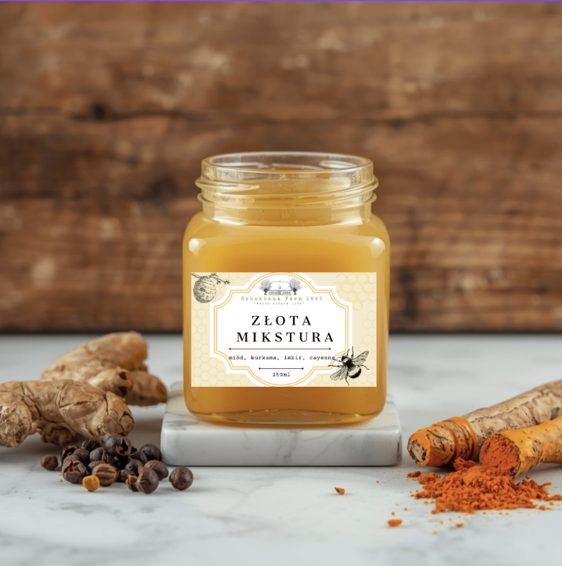 Nasz miód lipowy z dodatkiem kurkumy, imbiru i pieprzu cayenne. Rozgrzewający, przepięknie złoty miód - idealna propozycja dla fanów niezwykłych połączeń smakowych. Słodycz kremowego miodu perfekcyjnie równoważy się tutaj z ostrością pieprzu cayenne, a szczypta kurkumy i imbiru nadaje orientalnego posmaku. Dodaj łyżeczkę do kubka ciepłego mleka lub herbaty (pamiętaj, aby temperatura płynu nie przekraczała 40 stopni) i rozkoszuj się rozgrzewającym, wspomagającym odporność napojem! Idealny do zrobienia "złotego mleka" czy też lemoniady.