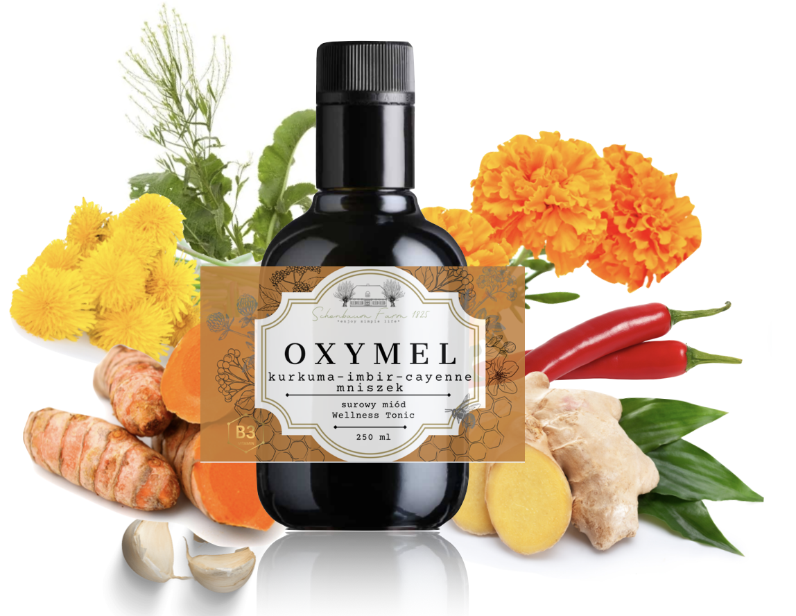 Nasz oxymel z kurkumę, imbirem i pieprzem cayenne jest delikatnie słodki od miodu i aromatyczny od przypraw z lekko pikantną nuta . Jest niepasteryzowany, niefiltrowany i naturalnie mętny, a zatem wciąż żywy i aktywny biologicznie. Ten naturalny syrop to doskonały, funkcjonalny dodatek do codziennej diety, ale i wparcie, gdy dopada Cię przeziębienie. W oxymelu może się wytrącić osad jak i powstać na powierzchni glutek- czyli matka octowa, niczym się nie martw, to naturalny proces, wstrząśnij i wymieszaj