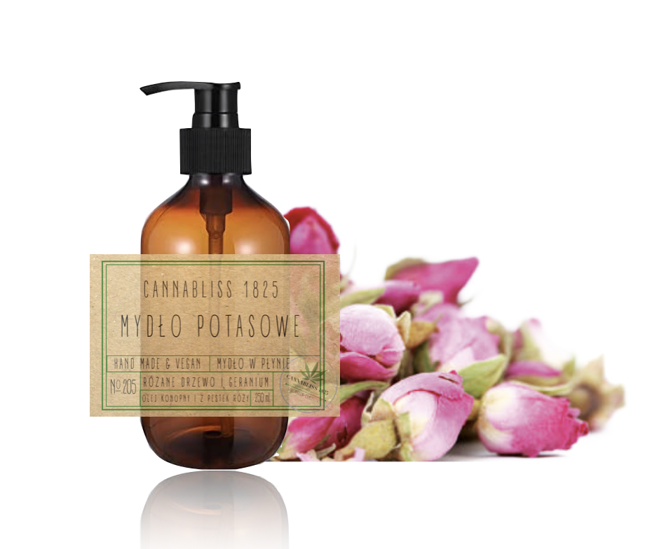 Bazą mydła potasowego jest olej konopny, oliwa z oliwek, olej ryżowy, olej winogronowy, olej słonecznikowy ług potasowy na hydrolacie z czarnego bzu. Po procesie saponifikacji dodajemy dodatkowy olej konopny i olej jojoba, olej ze słodkich migdałów, olej arganowy, olej z pestek róży, żel aloesowy olejki eteryczne. Witamina E nawilża i naturalnie konserwuje mydło