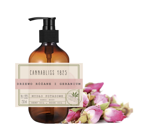Konopne mydło potasowe z dodatkowym olejem pestek dzikiej róży olejkiem różanym , z drzewa różanego i geranium