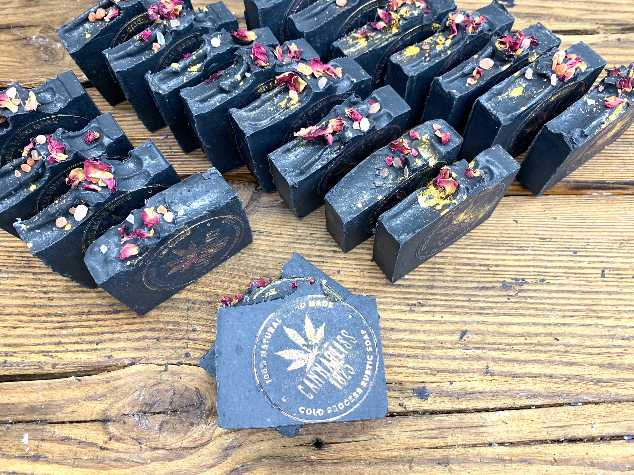 Bazą naszych mydeł jest ekologiczny olej konopny jaki sami wytwarzamy. Oprócz tego ług sodowy na hydrolacie różanym, olej konopny ,masło shea, masło mango, olej kokosowy, olej ze słodkich migdałów, olej jojoba, olej ryżowy ,olej Tamanu, olej rycynowy, oraz glinka kaolinowa, bentonitowa węgiel aktywny, witamina E.