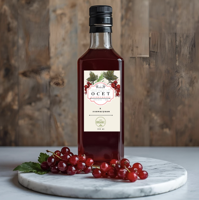 Opis produktu : Rzemieślniczy, niefiltrowany i niepasteryzowany ocet z czerwonej porzeczki, wzbogacony naturalnym rozmarynem. Powstaje w małych partiach w naszym rodzinnym gospodarstwie na Żuławach, według dawnej receptury octowej. Proces fermentacji przebiega dwuetapowo, z zachowaniem naturalnej „matki octowej”, która świadczy o żywej kulturze bakterii octowych. Intensywnie owocowy aromat czerwonej porzeczki łączy się z charakterystycznym, lekko żywicznym bukietem rozmarynu, tworząc wyrazisty i szlachetny smak. Produkt w stu procentach naturalny, bez konserwantów i dodatków technologicznych.
